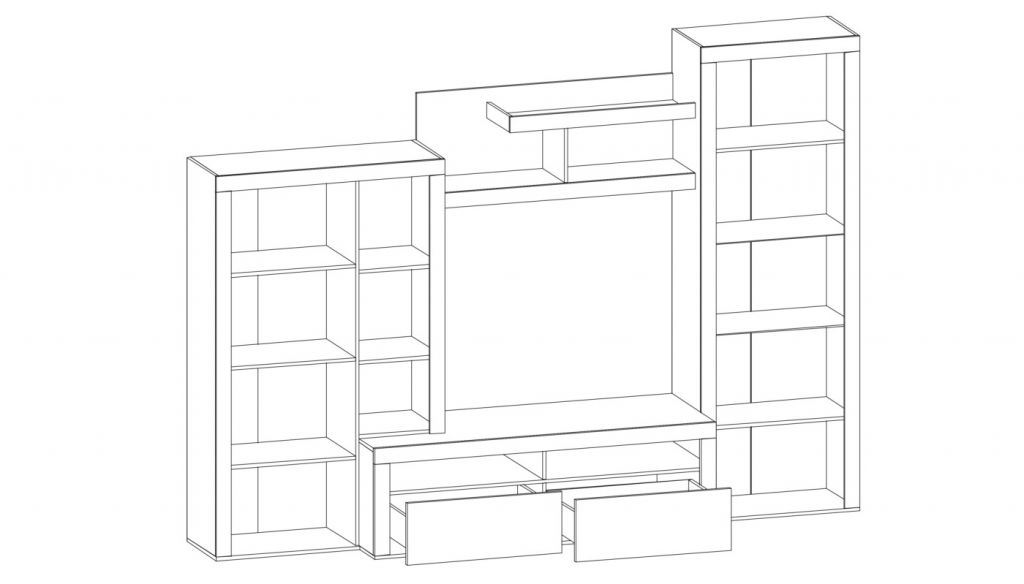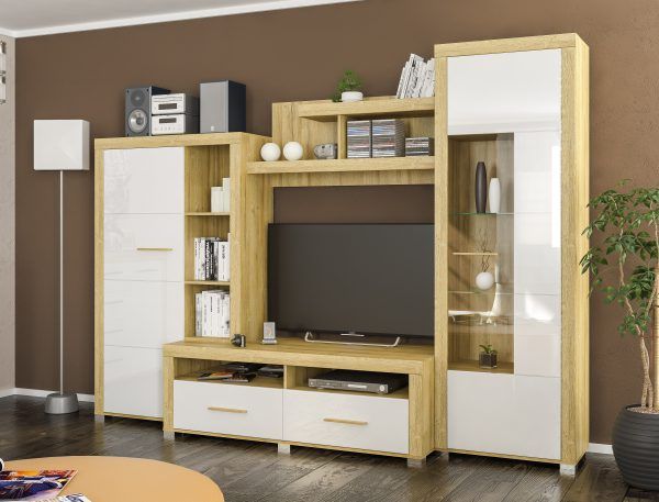 Стенка включает в себя два пенала и тумбу под телевизор.