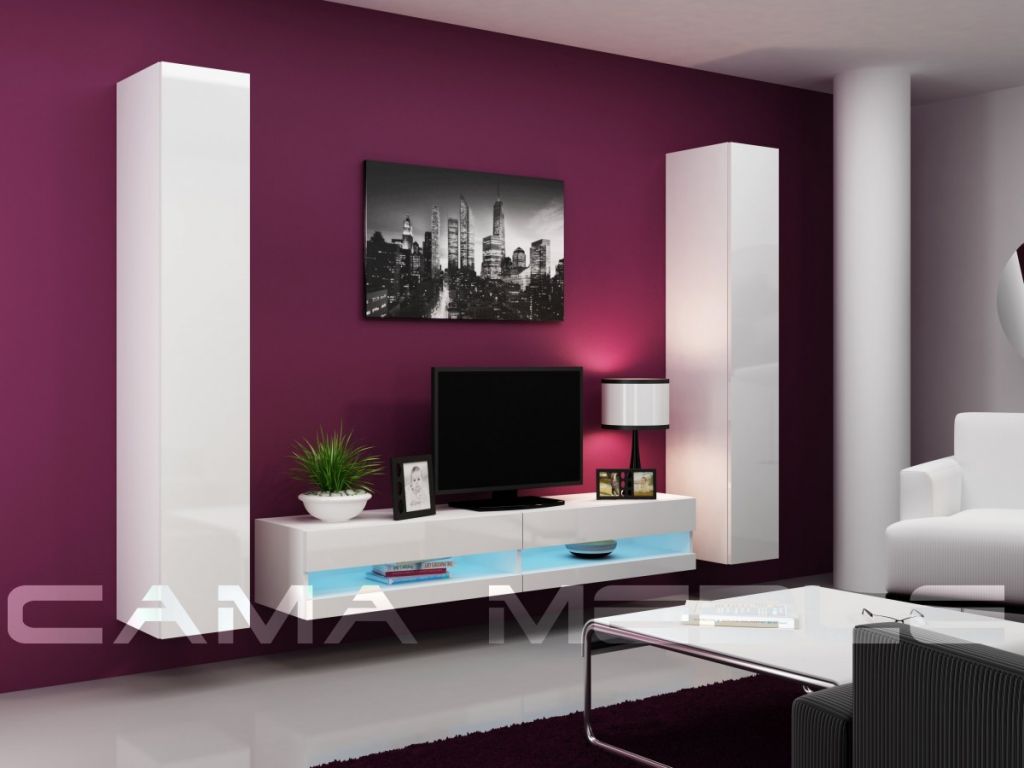 - тумба ТВ открытая - 1 шт. (В/Ш/Г - 30/180/42 см; по центру - открытая, без стекла; сверху и снизу - два глянцевых фасада (узкий - фиксированный); внутри - два отделения; дополнительно комплектуется подсветкой);