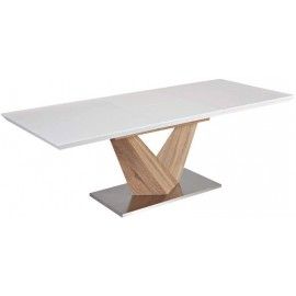 Стол Alaras представлен в стиле модерн.Габаритные размеры:длина - 160 см ( в разложенном состоянии - 220 см)ширина - 90 смвысота - 75 смМатериал: ножка стола дерево - дуб сонома,столешница МДФ - белый лак.