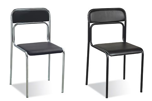 Кресло с металлической рамой, сидение и спинка обиты мягким синтетическим материалом черного цвета.